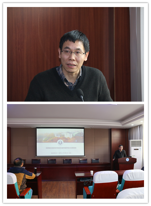 12月12日下午,华中师范大学李鸿飞教授应邀来黄色影片 作了题为《深度融合信息技术的高校教育教学模式创新实践》的教学研究报告。作为2018年教育部高等教育国家级教学成果特等奖得主,他介绍了以学生为中心的连接教育,构建信息时代的教育支撑体系;实现“以教为主”到“以学为主”,“以专业教育为主”到“以通识教育和专业教育为主”,“以课堂为主”到“课内外结合”,“以结果评价为主”到“结果和过程评价结合”的四个转变;构建“云+端”一体化教学模式;搭建“物理·资源·社交”三空间深度融合的智能型教学环境。这一报告让人耳目一新,为黄色影片 人才培养的信息化建设提供了宝贵经验和动力。