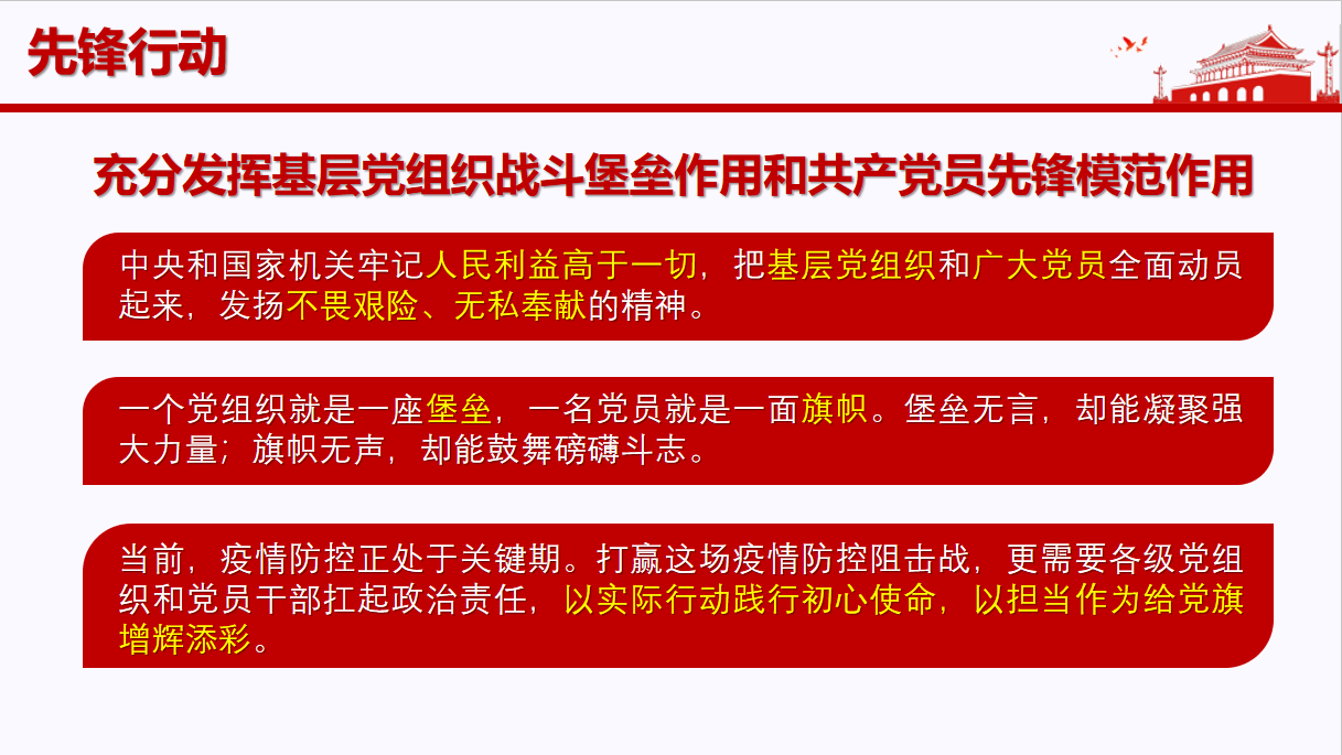 支部书记白春辉将学习文件总结为以下几点,党中央对疫情形势的判断是准确的,各项工作部署是及时的,采取的举措也是有效的;此次疫情是一次危机,也是一场考验。防控工作取得的成效,再次彰显了中国共产党领导和中国特色社会主义制度的显著优势;各级党组织要认真履行领导责任,特别是抓落实的职责,把党中央各项决策部署抓实抓细抓落地,让党旗在疫情防控斗争第一线高高飘扬;各级党组织和广大党员、干部把打赢疫情防控阻击战作为当前的重大政治任务,把党的政治优势、组织优势、密切联系群众优势转化为疫情防控的强大政治优势;要在疫情防控第一线考察、识别、评价、使用干部。