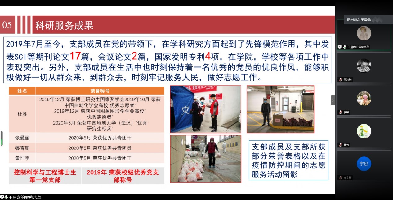 博士生党支部深入开展“不忘初心,牢记使命”主题教育,推进“两学一做” 学习教育常态化制度化,积极开展批评与自我批评,认真开展谈心谈话,听取群众意见,围绕检视反思发现的问题,明确整改方向,制定整改措施并逐一落实。支部在加强个人学习的同时多次组织集中学习,各支部成员能够及时发现问题并加以解决。支部成员在学术上严谨认真,取得一系列学术成果。部分支部成员在疫情期间投身抗疫一线,用实际行动诠释了人民有困难,党员冲在前。