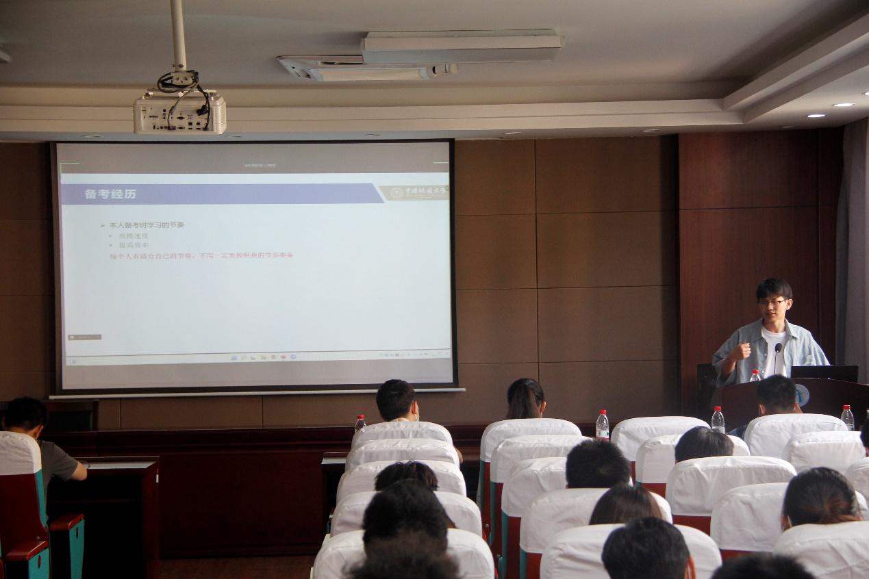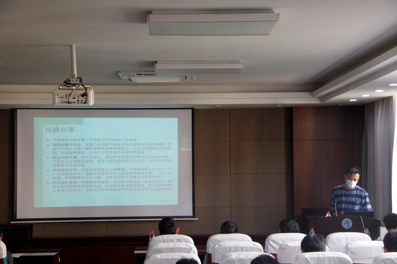 紧接着张健荣学长向大家分享了上岸本校的经验和过程,他从准备环节、备考环节和学习环节为同学们进行了详细的分享。学长表示在选择院校的过程中一定要依照自己的实际情况来进行选择,在考虑个人意愿等因素后,也要从不同的渠道去了解院校的报名情况和报录比。同时为我们分析了选择本校考研的优势以及考研本校需要做哪些准备,并建议大家要合理规划时间,在不同的时间段要进行不同内容的学习。