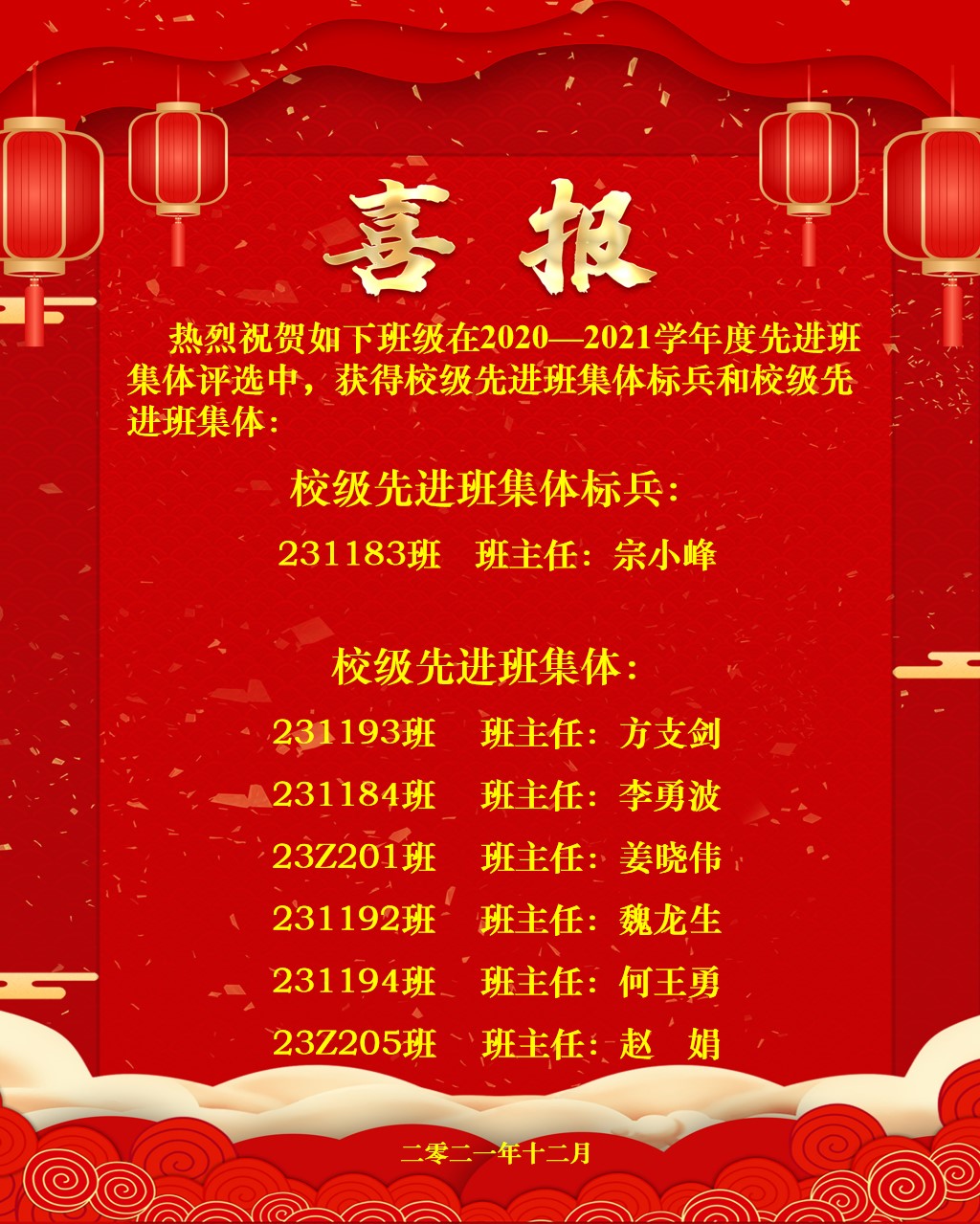 根据《关于做好2020-2021学年度先进班集体(标兵)评选工作的通知》、《关于开展2020-2021学年先进班集体标兵评审答辩工作的通知》,经过学院自评、学校评审,评定先进班集体标兵(综合奖)20个、先进班集体标兵(单项奖)7个、先进班集体104个,黄色影片 以下班级获得校级先进班集体标兵、校级先进班集体: