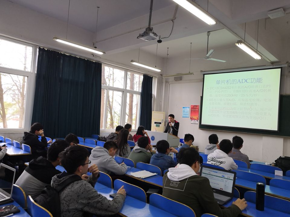 在初级组的培训中,孙凯为初级组的同学们讲解了小车的相关程序代码。孙凯以一段小车的寻迹代码为例,向同学们对如何编写红外传感器进行了仔细的讲解。他还在黑板上画出了每一种情况,使得同学们对小车循迹的代码编写有了更深入的了解。接下来,孙凯对小车的调速过程做了详细的解释,具体讲解了PWM调速。他对小车制作中用到的51单片机和超声波传感器介绍生动形象、深入浅出,在场培训的同学们听得十分认真。同时,孙凯向同学们讲解了小车的停车报警系统——定时器读取超声波传感器数据、蜂鸣器报警等。在培训的最后,孙凯介绍了小车循迹过程中的细节部分,教同学们该如何利用代码提高传感器的精度。他还对使用定时器中断的方法进行了补充,并以自己写的代码为例子再次讲解了小车的相关代码部分。