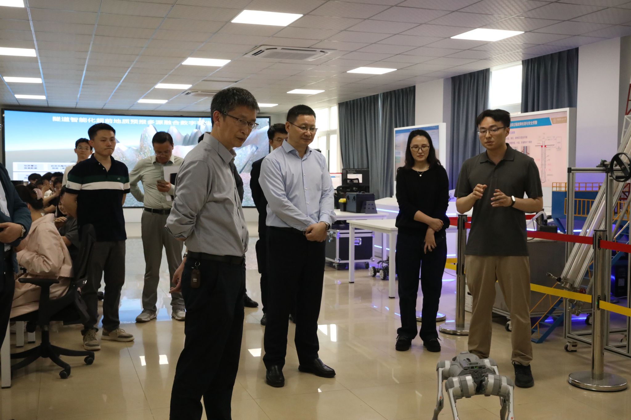 刘杰书记首先参观了学院智能地质钻进、海洋地质装备智能化技术、资源环境智能感知与监测、多机器人与人机协同技术等13个学科实验室,详细听取了实验室负责人关于最新研究成果、技术装备及产业化应用情况的汇报。刘书记对学院在科研创新和技术研发方面所取得的成就给予了高度评价,鼓励学院继续加大科研投入,深耕技术攻关,进一步加强和企业及具体应用场景的结合,推动科技成果转化,为国家经济社会发展贡献力量。