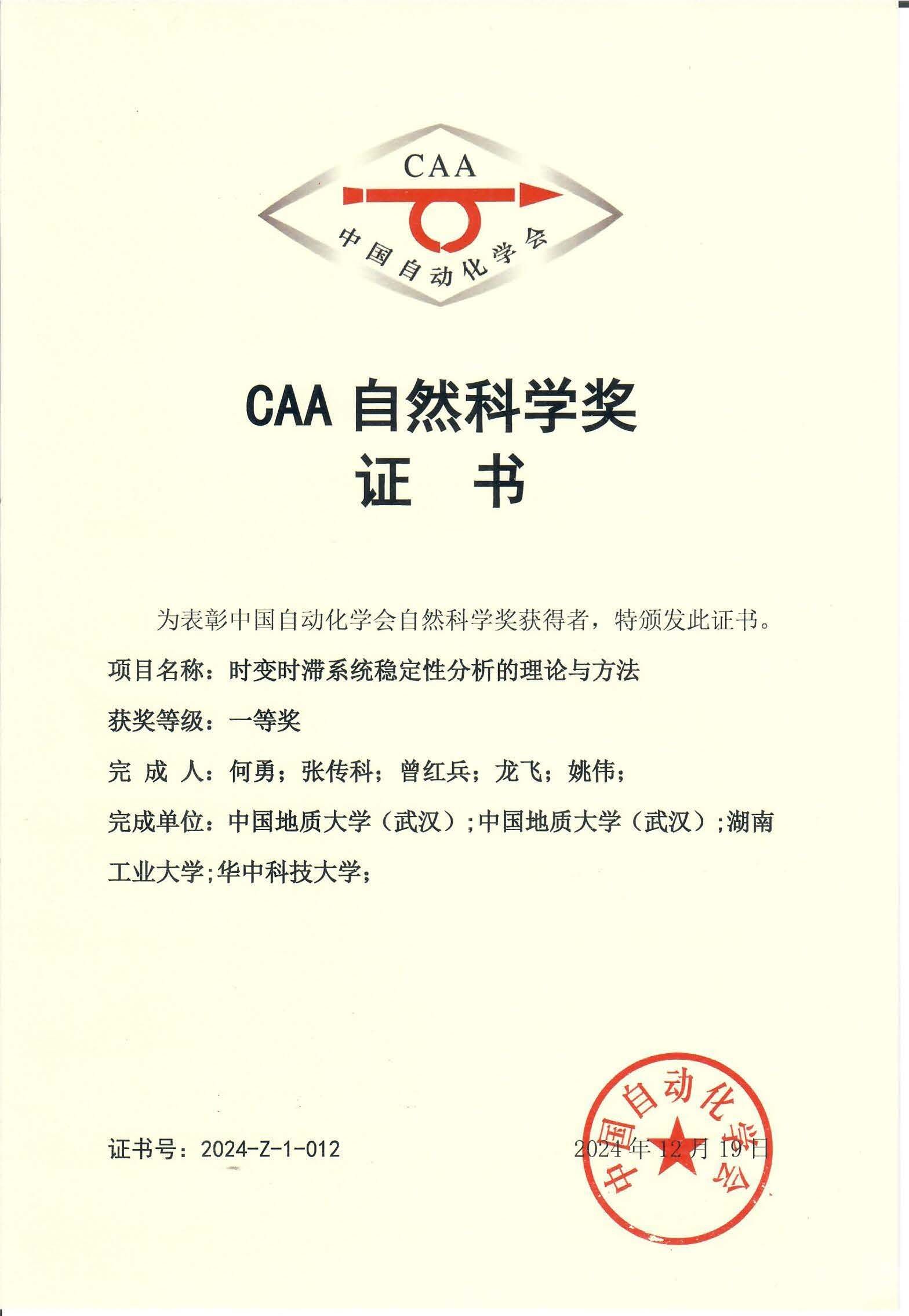 5月25日,2024年度中国自动化学会科学技术奖励颁奖仪式在北京举行。由自动化学院何勇教授、张传科教授为第一、第二完成人的科研成果“时变时滞系统稳定性分析的理论与方法”荣获自然科学奖一等奖。