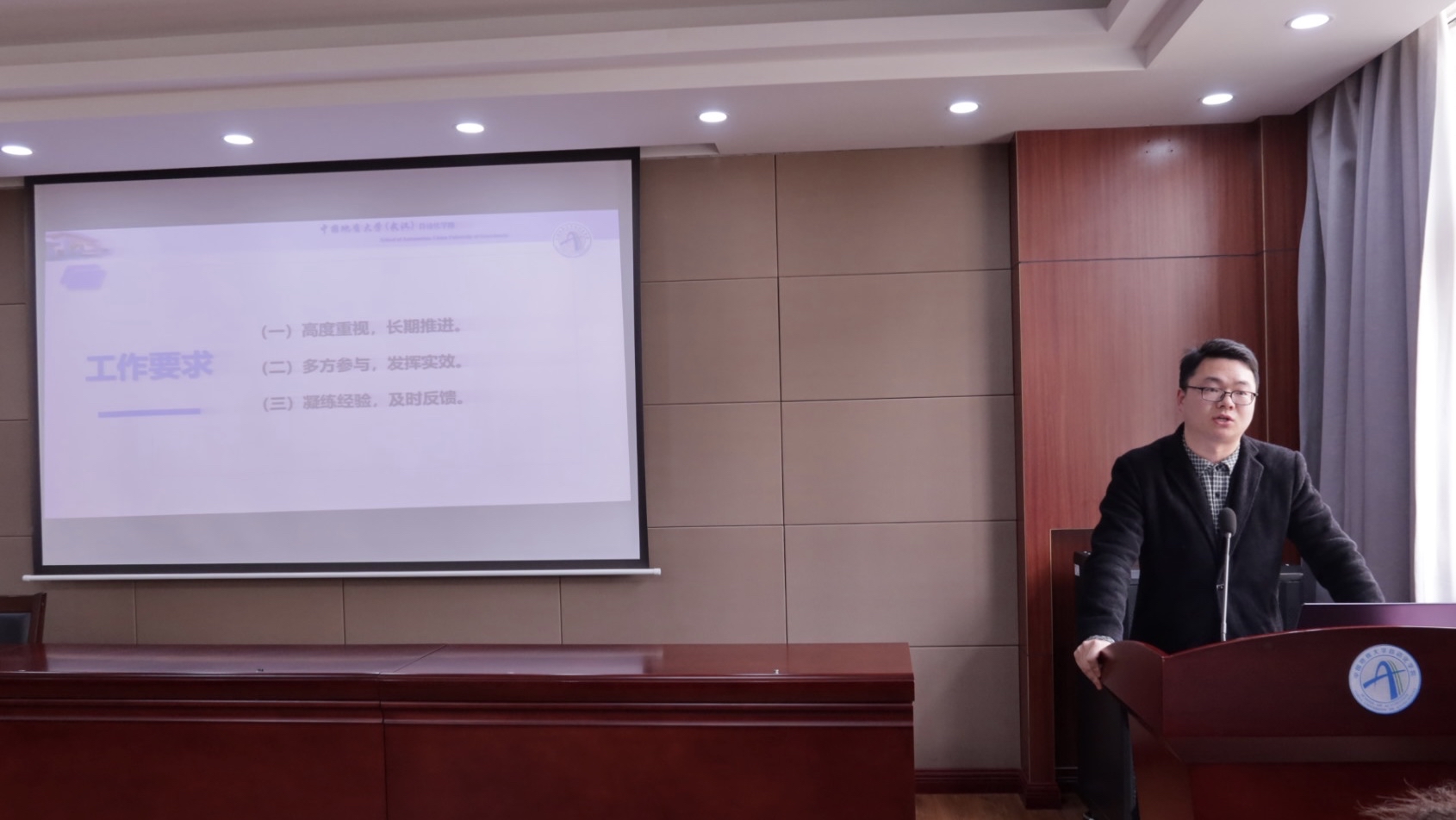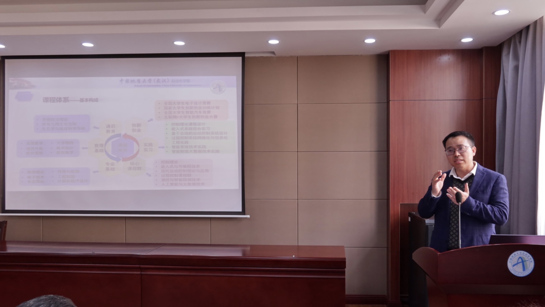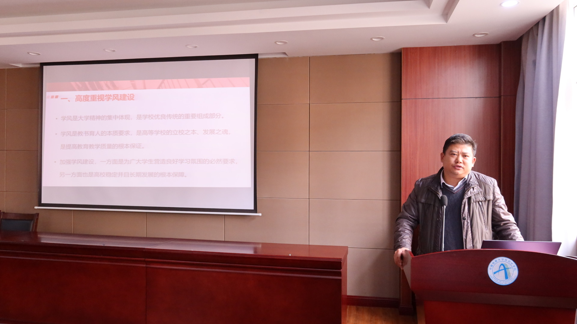 其次学院副院长宗小峰老师作“凝心聚力抓卓越学风”的主题讲话。首先,宗小峰老师介绍了学院课程体系,并对学院保研情况和学业预警进行说明,重点强调了班主任和班委的重要作用,要充分带动班级同学努力学习,同时加强班级建设和体育锻炼,最后宗老师提出几点希望,希望各班级发挥主观能动性,创新举措,提高学生学习的自觉性和主动性,让优良学风入“脑”、入“耳”、入“心”。