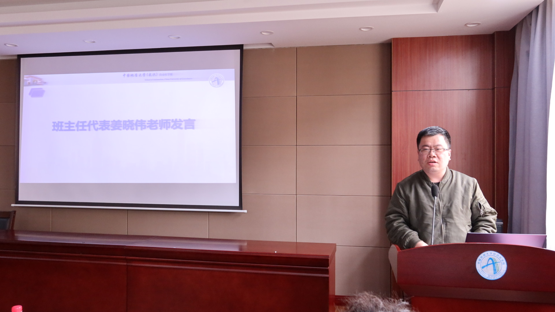接着班主任代表姜晓伟老师发言。他首先提出同学们要树立自己的长期目标和短期目标,其次分享了自己作为班主任的实际工作经验,重点阐明了培养得力的班委团队的重要性。