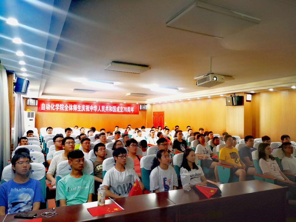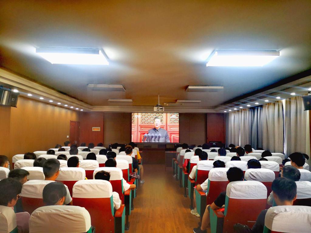 师生共同观看庆祝中华人民共和国成立70周年大会直播,共同祝福祖国70华诞。观看过程中,同学们聚精会神、热泪盈眶、掌声不绝,共同见证祖国高光时刻。