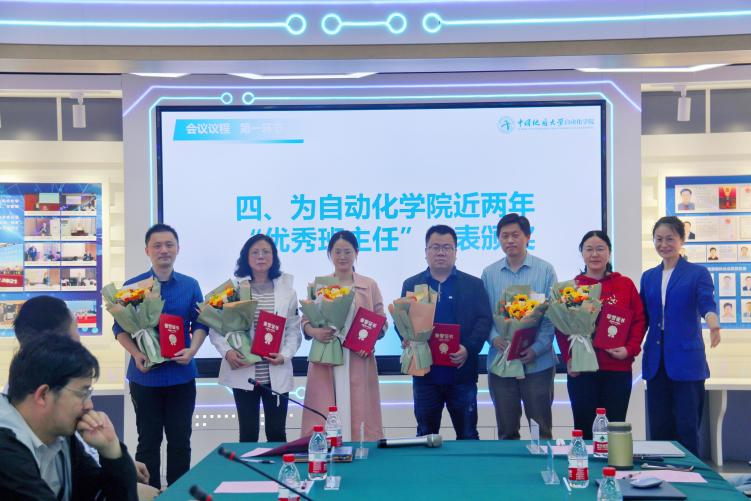 近两年,学院涌现了一批教学能力精湛,师德师风优良的班主任老师。本次会议上,蒋怀柳代表本科生院为近两年学院“优秀班主任”代表颁奖,各年级辅导员上台献花并合影留念。