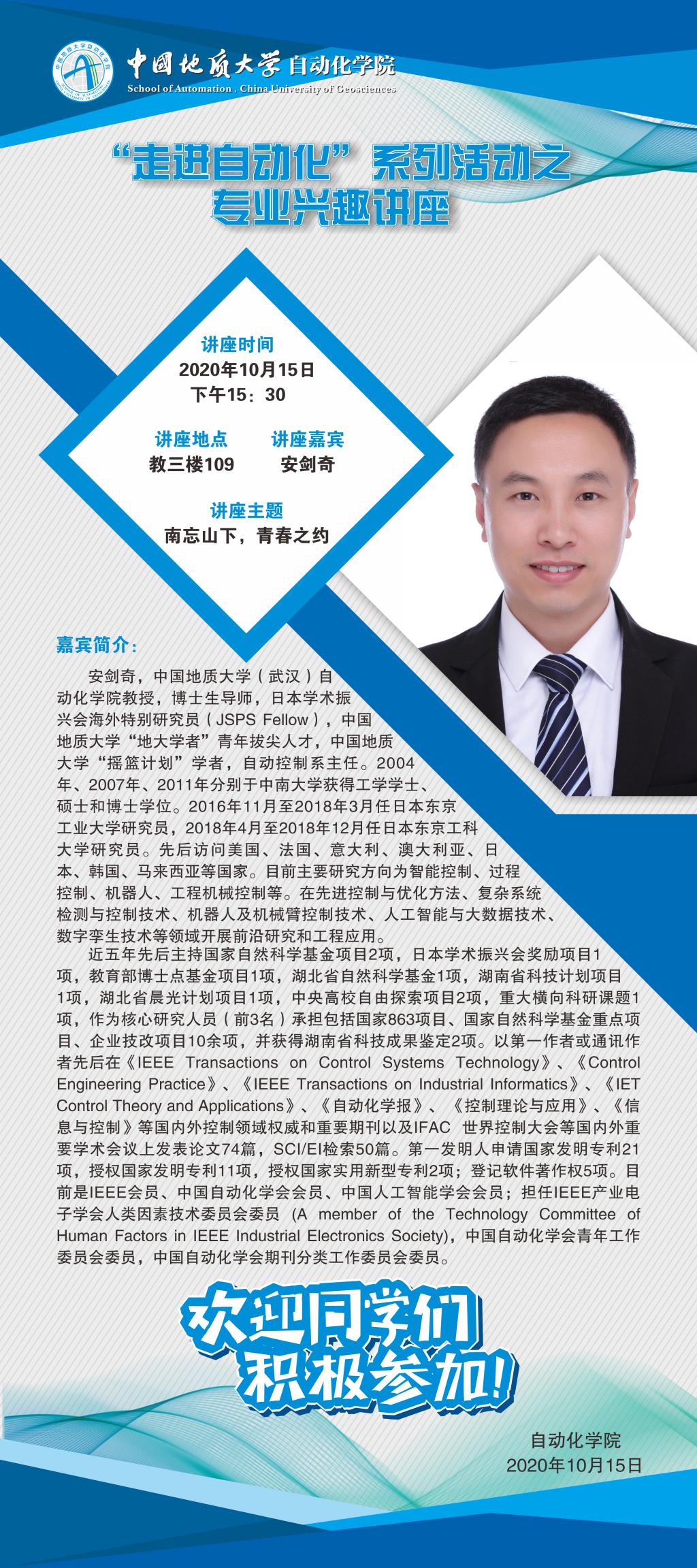 黄色影片 首届“走进自动化”活动开幕式将于10月15日下午15:00在教三109举行,在开幕式后将进行系列活动第一项,专业兴趣讲座。邀请到黄色影片 安剑奇老师进行主题为“南望山下,青春之约”的讲座。本次“走进自动化”系列活动将历时两个半月,共分为开幕式、师生交流、教育实践、成果展示、闭幕式五大板块展开,帮助同学们更好的了解黄色影片 ,在全院范围内营造创新实践的良好氛围。欢迎老师、同学们积极参与!