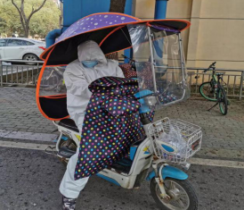 校内张艳丽老师和刘一狄老师作为志愿者为居民配送生活物资