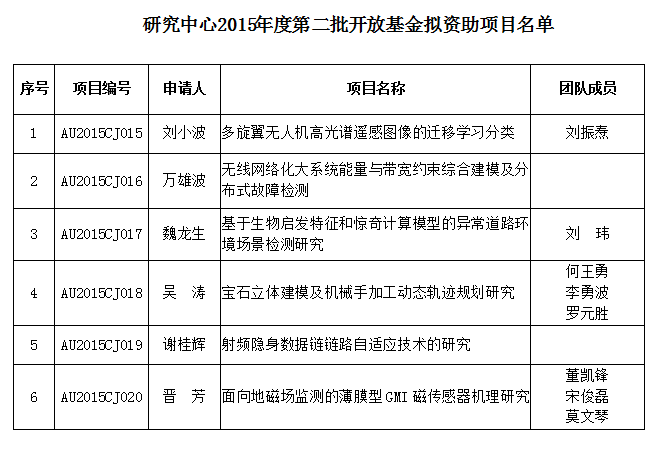 根据《复杂系统先进控制与智能地学仪器研究中心2015开放基金项目申请指南》和开放基金(第二批)申请通知,至申请截止日共收到6项开放基金项目申请书,按照“公平竞争,择优支持”的原则,研究中心学术委员会外审专家对所有开放基金项目申请书进行了评审。经院学术委员会审议,拟资助 “多旋翼无人机高光谱遥感图像的迁移学习分类”等6个项目作为2015年度第二批开放基金项目,现予以公示。公示时间:2016年1月15日至1月18日。公示期间,如对项目资助有异议,请以书面形式反馈学院办公室。