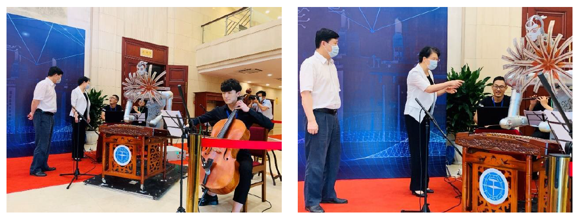 自主研发的智能音乐情感机器人“海百合”二代参加了本次闭幕式,承担了红毯迎宾仪式的全场音乐演奏,热烈欢迎张定宇、李德仁、段凯等十七位杰出的科技工作者代表和抗疫功臣浓重入场。