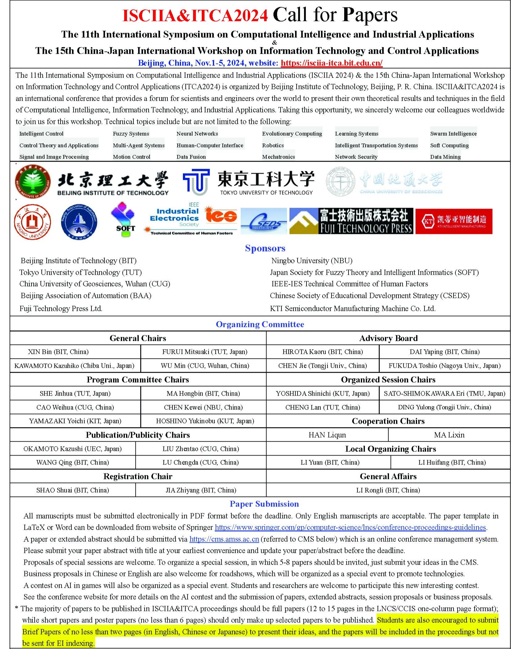 由中国地质大学(武汉)、北京理工大学和日本东京工科大学主办的第11届ISCIIA2024和第15届ITCA2024联合国际会议将于2024年11月1日至5日在北京召开。欢迎大家踊跃投稿。详情请见会议网站://isciia-itca.bit.edu.cn/
