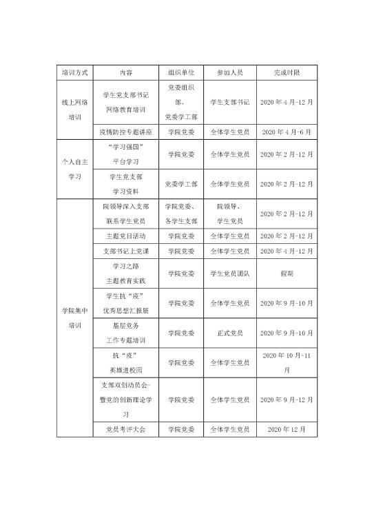 学生党员教育培训工作是高校党建的基础工程,也是思想政治工作的重要抓手。为学习贯彻习近平新时代中国特色社会主义思想和党的十九大精神,持续深入推进“两学一做”学习教育制度化、常态化,推动高校建立“不忘初心、牢记使命”主题教育制度,引导学生党支部以政治建设为统领,以组织力提升为重点,全面提升党建工作质量。按照2020 年学院工作总体部署和学院学生工作要点,结合疫情防控新形势新变化,现将 2020 年度学生党员教育培训计划的有关事项通知如下,请各学生党支部认真落实。