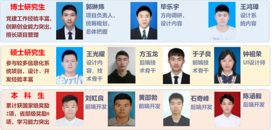 “在党史学习中,我被中共一大代表平均年龄只有27.7岁所震撼。我就在想,作为新时代青年的我们能为党做什么样的贡献。”带着这个思考,时任博一党支部书记的郭琳炜同志在开展支部工作的过程中,发现多个党支部长期以来都一直存在着一些共性问题。于是,他创新思路,萌生了设计党建信息化系统来解决这些问题的想法,并在导师曹卫华教授和学院党委副书记王向东、团委书记黄兰华的指导与支持下,组建了“--博”团队,组织大家利用课余时间进行设计开发。学校党委组织部、研究生院(党委研究生工作部)、信息化工作办公室等职能部门也对该项目表示大力支持,不仅给予了专门课题立项,还配备了专家指导,为项目的顺利落地保驾护航。