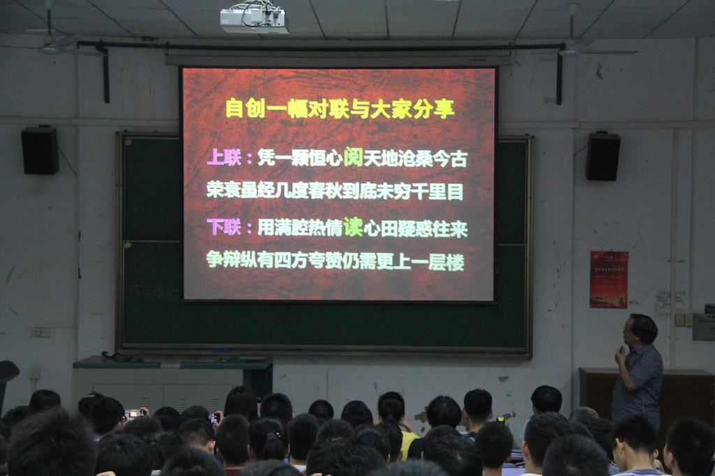 馆长对如何利用好图书馆给出了建议。他提倡大学生要养成良好的阅读习惯,珍惜课余时间;要强化信息素养,善于利用图书馆纸质资源、外文资源、中文资源等。他表示欢迎同学们积极参加图书馆各种阅读活动,并提倡新生珍惜美好的大学时光,遨游在图书馆知识的海洋,徜徉在令人心驰神往的人间天堂。 馆长精彩的演讲不时赢得现场同学的阵阵掌声,他引经据典说明了“多读书、读好书、好读书”的好处,并论证了理工科学生更要提高人文素质以及提高读书质量与效率的重要性。最后馆长以自己亲身经历寄语新生学会享受阅读的乐趣,阅读改变人生,习惯改变未来。并自创一副对联与新生分享:凭一颗恒心阅天地沧桑今古荣衰虽经几度春秋到底未穷千里目;用满腔热情读心田疑惑往来争辩纵有四方夸赞仍需更上一层楼。