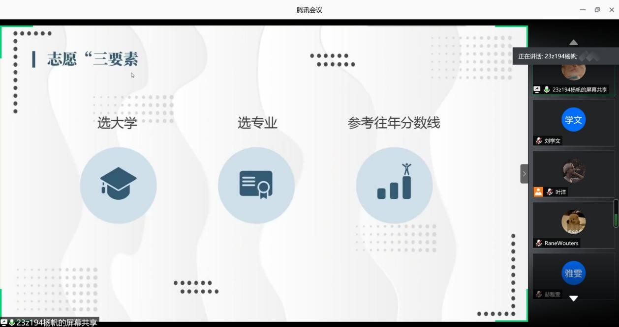 杨帆同学讲解了志愿填报的注意事项。他首先分析了志愿填报的三要素:选大学、选专业、参考往年分数线。在选大学时一定要全面了解意向高校基本情况;在选专业时要考虑到专业的内涵,如专业培养目标、专业培训要求、研究领域等;参考往年分数线时,可以通过高校招生网、高校招生宣传材料找到相关信息。杨帆同学还解释了志愿填报中的“退档”、“滑档”、“平行志愿”的意思,并重点向高中毕业生强调志愿填报中的五大误区包括照搬往年录取分数填志愿、不重视招生章程、家长过度掌控、不了解学校实情、专填热门专业等。