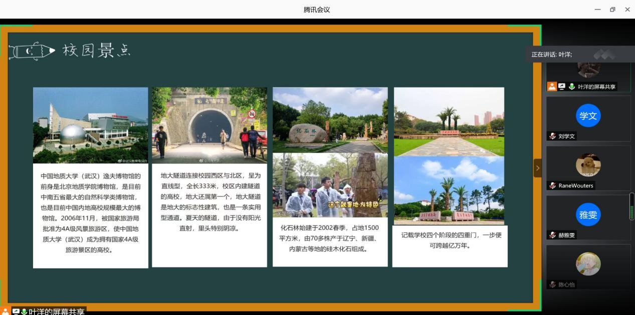 叶洋同学介绍了中国地质大学(武汉)的基本情况。他指出,中国地质大学(武汉)是国家“211工程”、“985工程优势学科创新平台”重点建设高校、国家“双一流”建设高校,地球科学领域进入ESI学科排名前1‰,被誉为“中国地球科学的最高学府”。叶洋同学还介绍了学校的特色活动,零点升旗,新年音乐会,校运会开幕式。