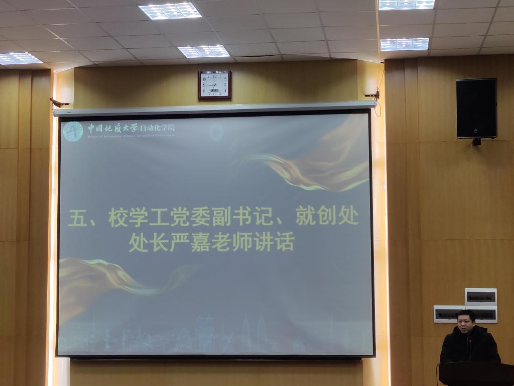 大会第四项,校学工党委副书记、就创处处长严嘉老师讲话。严老师首先代表学校党委首届 “走进自动化”系列活动的成绩表示肯定与赞扬,对在本次活动中积极参与的学生表达了祝贺与感谢。随后,严嘉老师结合现在国际大背景环境提出当代青年的责任与担当,唯有加强技术研发以巩固以进一步提高我们国家的科技实力。他希望通过“走进自动化”活动可以将一二课堂交叉融合,同时同学们积极参与专业实践活动,将个人所得与国家需要、国家战略结合。