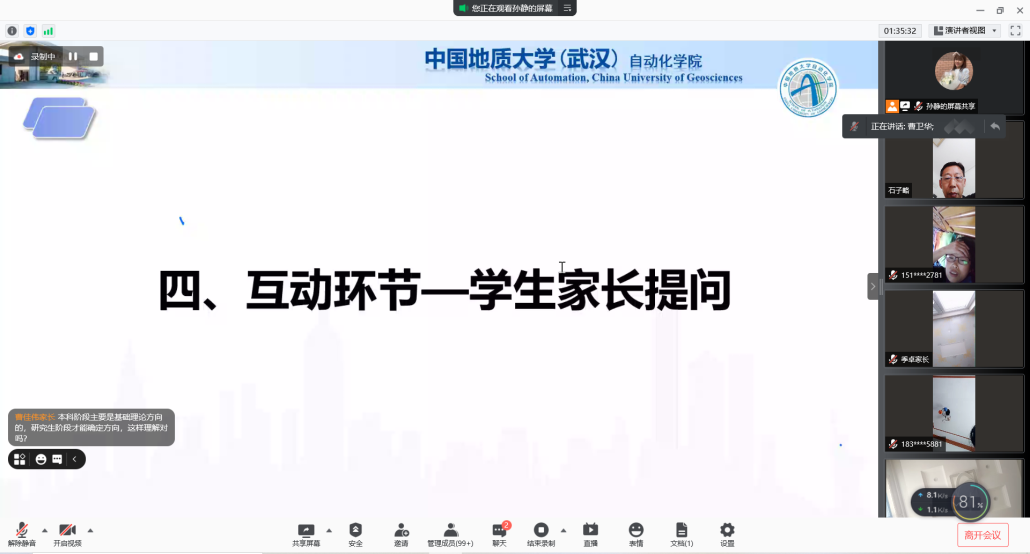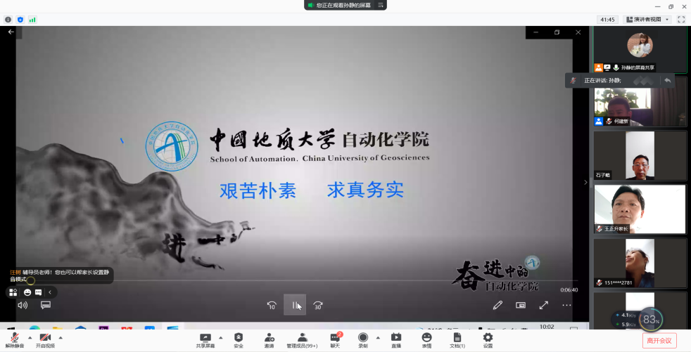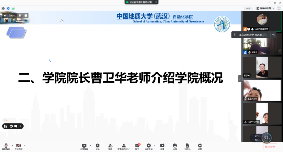 召开2021级新生家长线上座谈会。院党委书记董浩斌老师、院长曹卫华老师、院党委副书记何建新老师、副院长陈鑫老师、副院长宗小峰老师、副院长熊永华老师、副院长陈略峰老师、自动控制系系主任安剑奇老师、测控技术与仪器系系主任董凯锋老师、智能系统研究所所长刘振焘老师以及其他老师参加本次座谈会。学院召开此次新生家长座谈会旨在更好促进家校联合,让家长们对学校和学院有更加深入地了解。