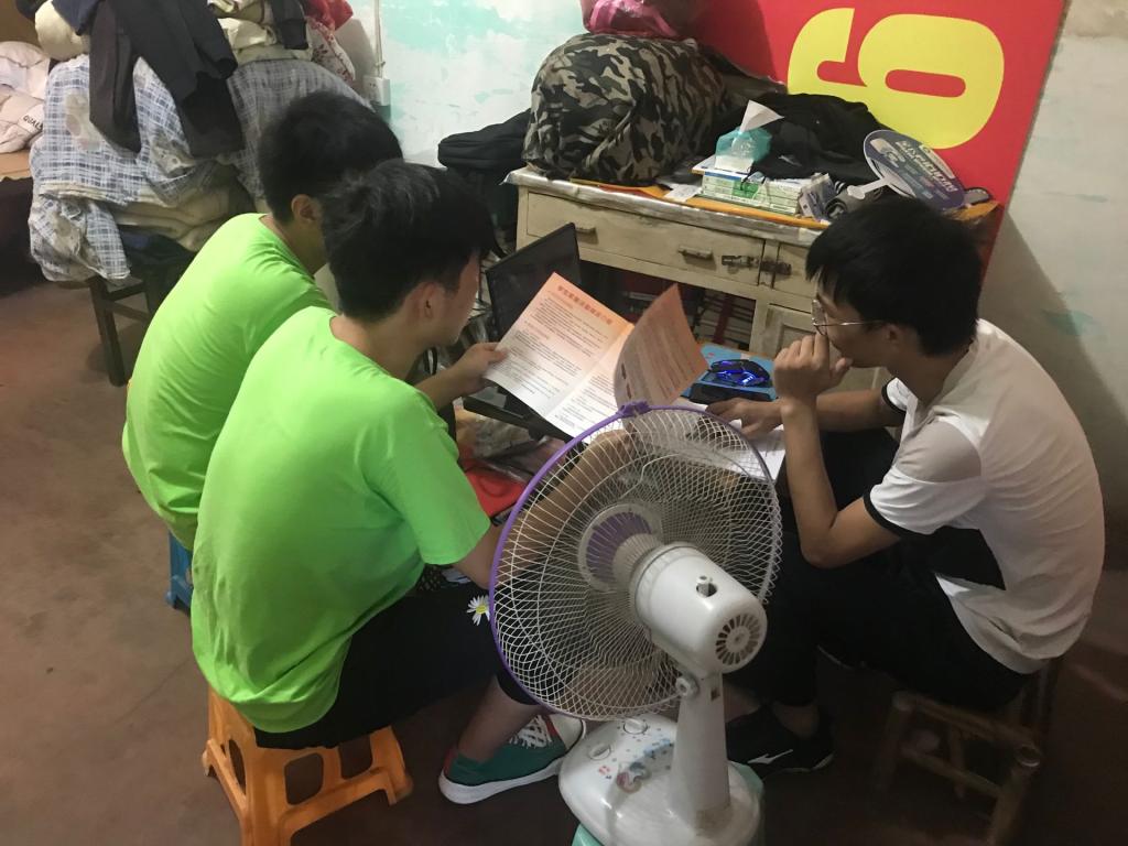钱浩同学(左一)和叶洋同学(左二)向邢振新同学介绍学校奖励资助政策