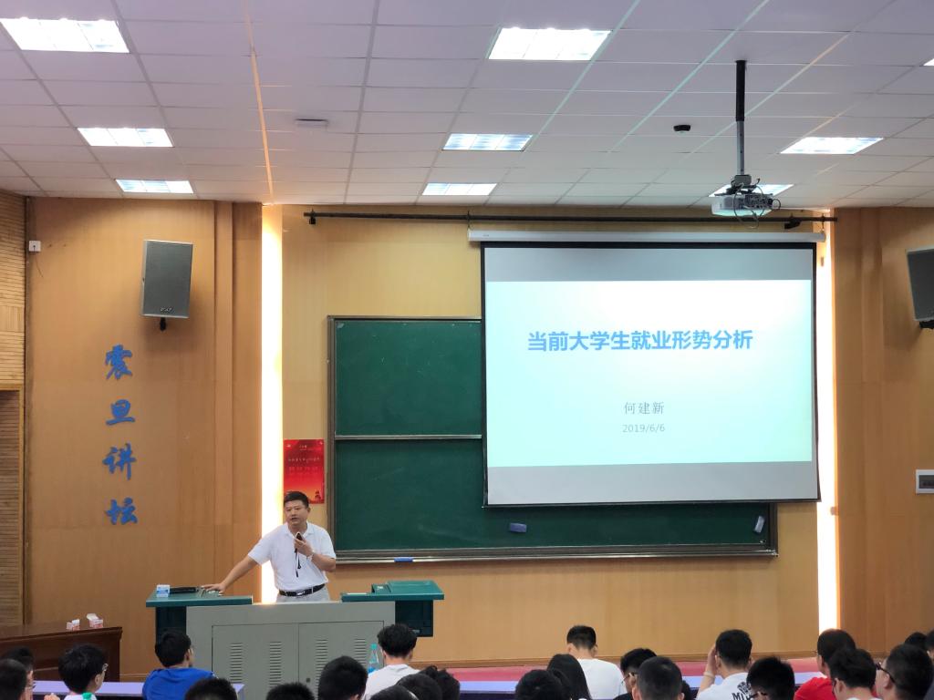 实际情况,特制定2016级学生就业形势分析课程,第一讲课程由学院党委副书记何建新老师授课,何老师主要结合时代需要为同学们分析了当前大学生所面临的就业形势。